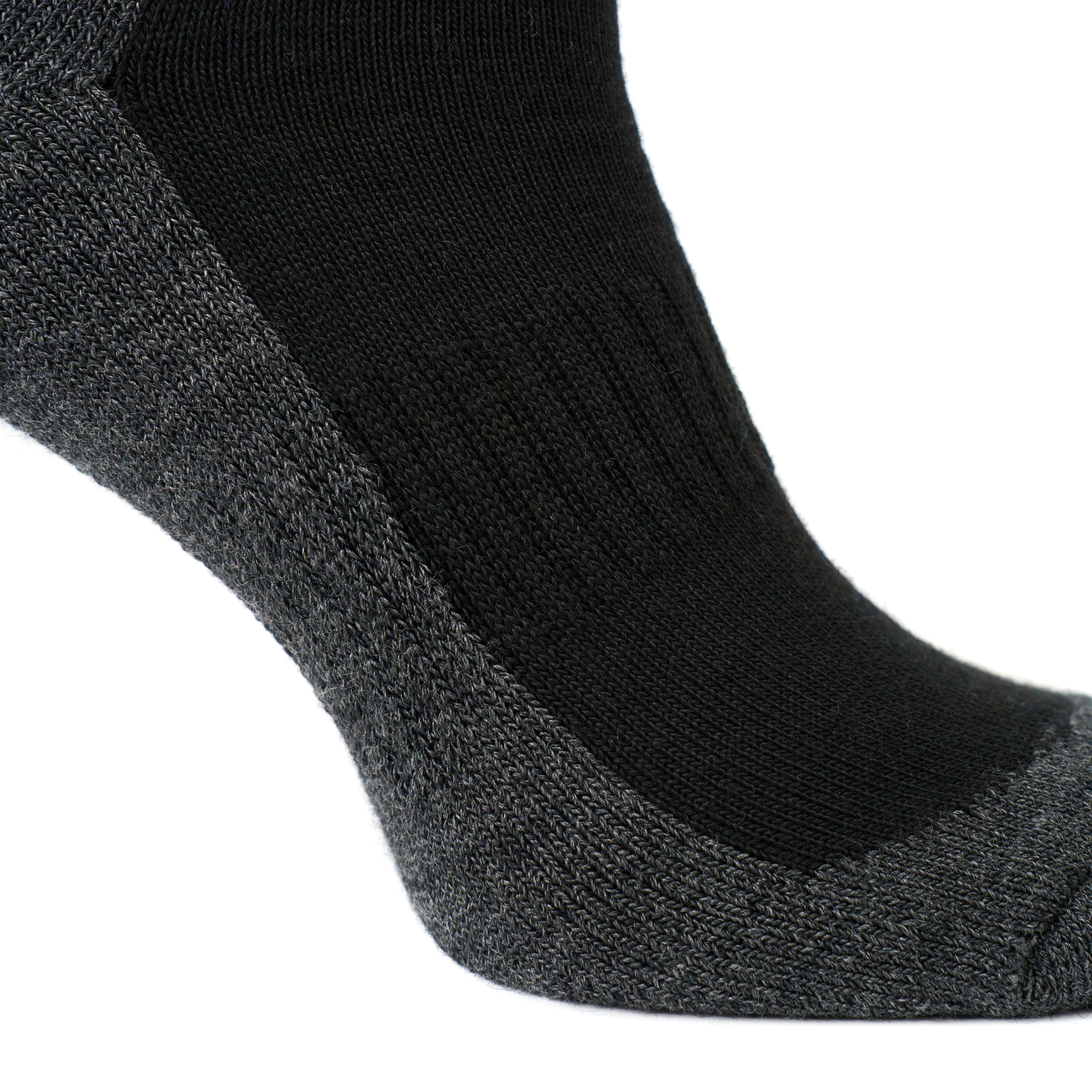 Zeķes ir polsterētas, ar īpaši mīkstu papēdi un pastiprinājumu vietās, kas visvairāk tiek noslogotas. Savelkošā gumija pēdas vidusdaļā nodrošina stingru piegulumu, lai zeķes nešļuktu un neberztos. Merino vilna pasargā kājas no aukstuma, bet vienlaikus nodrošina mitruma regulāciju un ļauj tām elpot arī intensīva darba laikā.